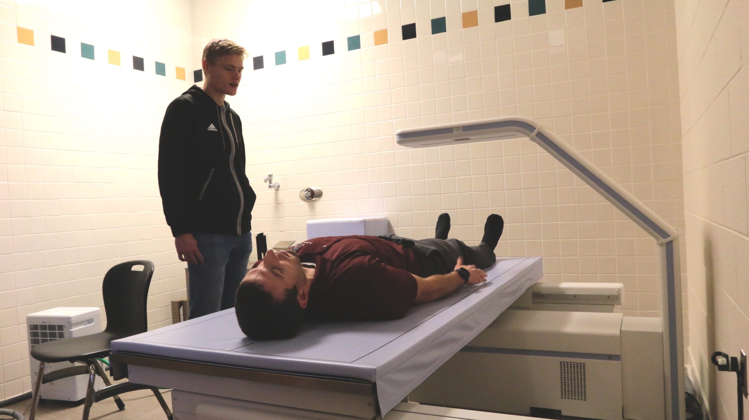 Alma College is also “here” to educate students and benefit the local community, and Montoye said the DEXA scanner is a good example of how the college lives those tenets of its mission. While students are not trained to read and interpret the data that the DEXA scanner provides — Montoye handles that task — they are able to use the machine, and they help administer the tests.